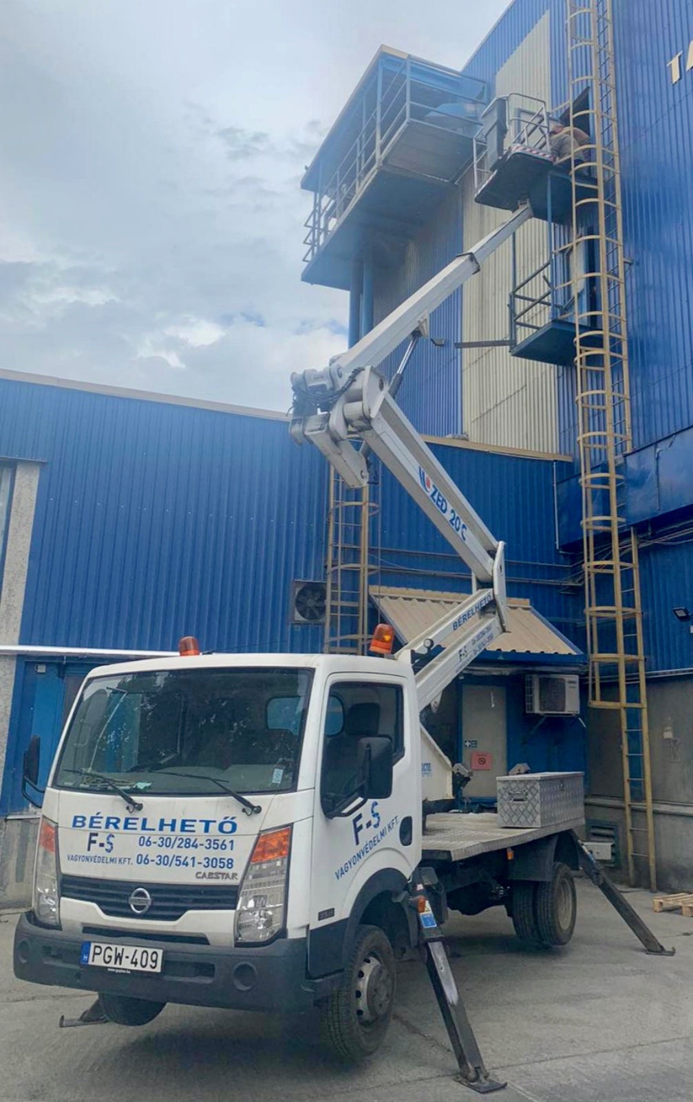 Nissan Cabstar típusú, korszerű emelőkosaras autónk 21 méteres munkamagasságig megbízhatóan üzemeltethető.